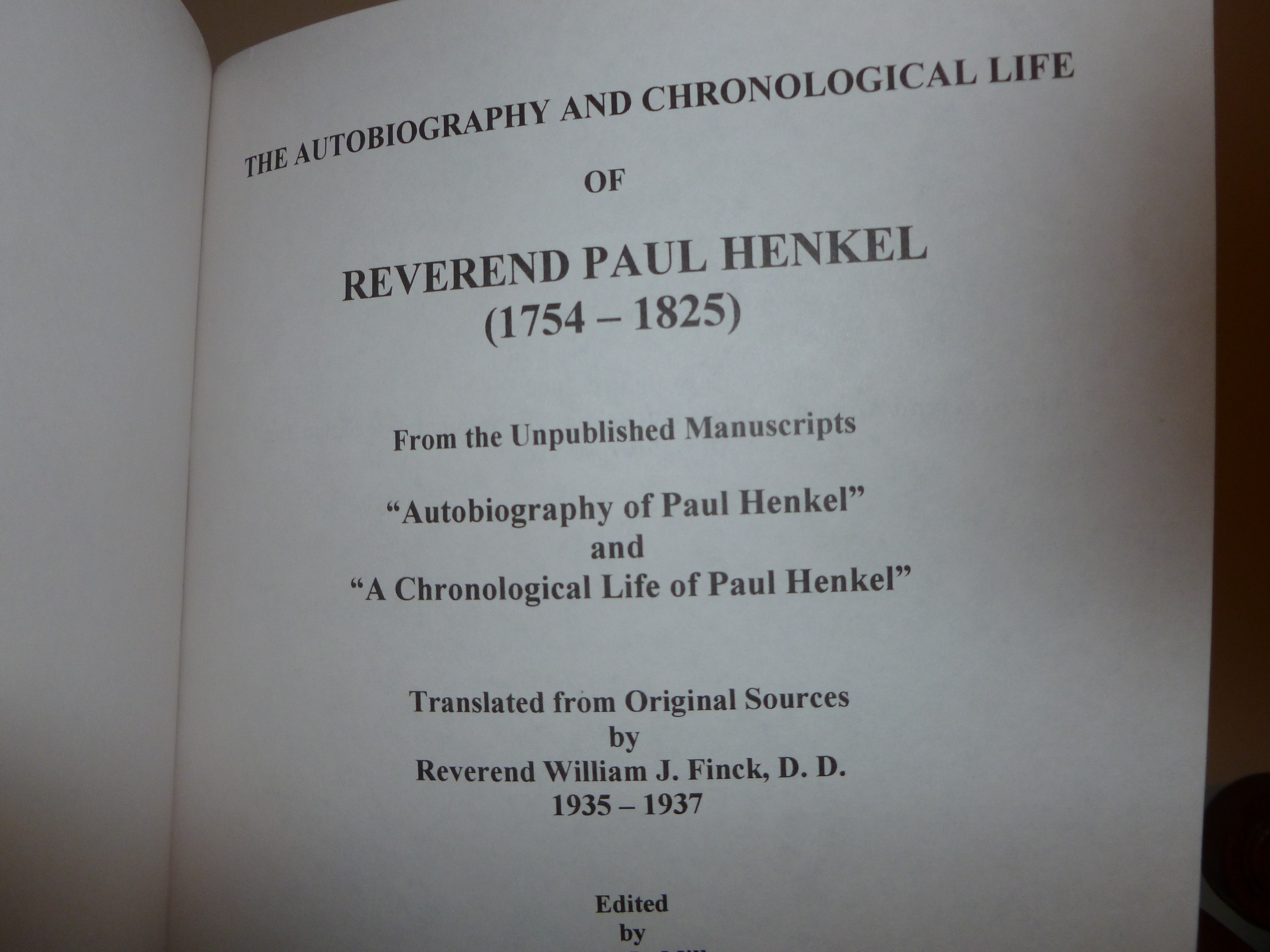 The diaries and journals of Reverend Paul Henkel were translated from German to English by Reverend William J. Finck, D.D. from 1935 – 1937; edited by Melvin L. Miller from 1991-1997; edited by Reverend Anthony Jacob Henckel Family National Association, Inc. Officers from 1999-2002; and published by Reverend Anthony Jacob Henckel Family National Association, Inc. in 2002.